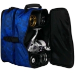 Fabricada en material hidro-repelente, cuatro compartimentos ajustables para almacenar hasta 8 bobinas o accesorios varios y uno central para carretes. Se pueden conectar varias entre sí para un cómodo transporte.