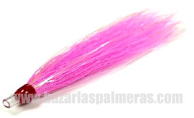 RAFIA MONTADA SIN ANZUELO - Tamaño aprox: 8 cm - Color: ROSA - Pack 10 uds.Rafia de pelo con cintas holográficas cordadas en tubo de plástico rígido.