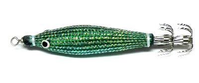 Este señuelo, gracias a la purpurina siliconada que posee emite destellos que hacen mucho más fácil e instintiva la captura del calamar.
